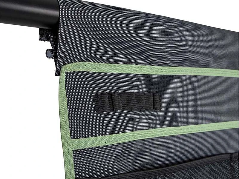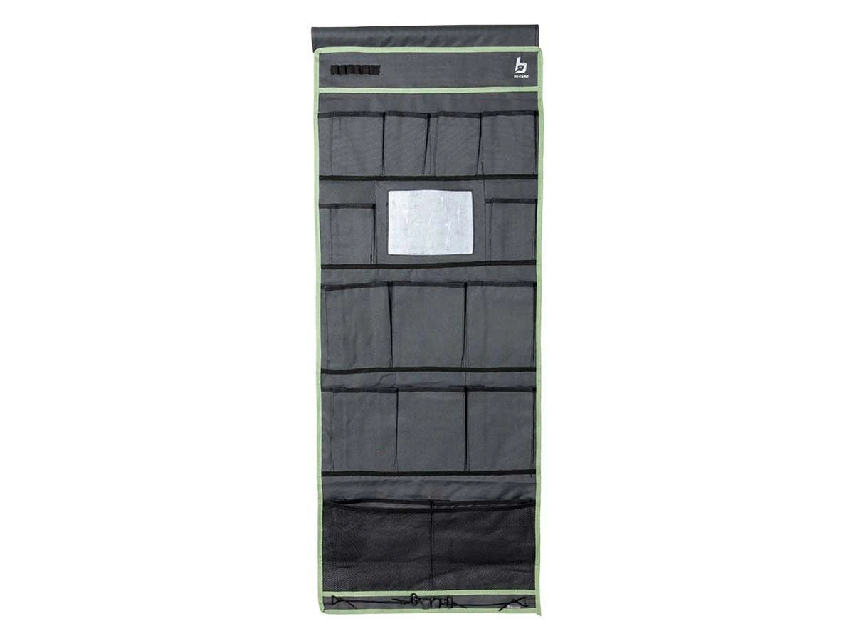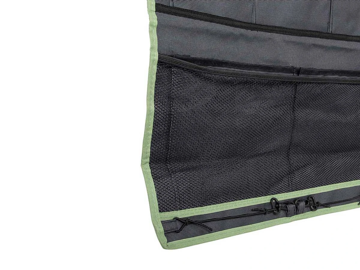 Een multifunctionele 14-vaks organizer met spiegel. Beschikt over 2 ruime vakken, 6 medium vakken, 6 kleine vakken en een spiegel. Eenvoudig en op diverse manieren te bevestigen. Zo kan dit tentschort met de pees worden opgehangen aan een caravanrails, met het klittenband aan een tentstok of met de zeilogen aan haken. De lussen onderaan zorgen voor extra fixatie. Gemaakt van een hoge kwaliteit 600 denier polyester.
