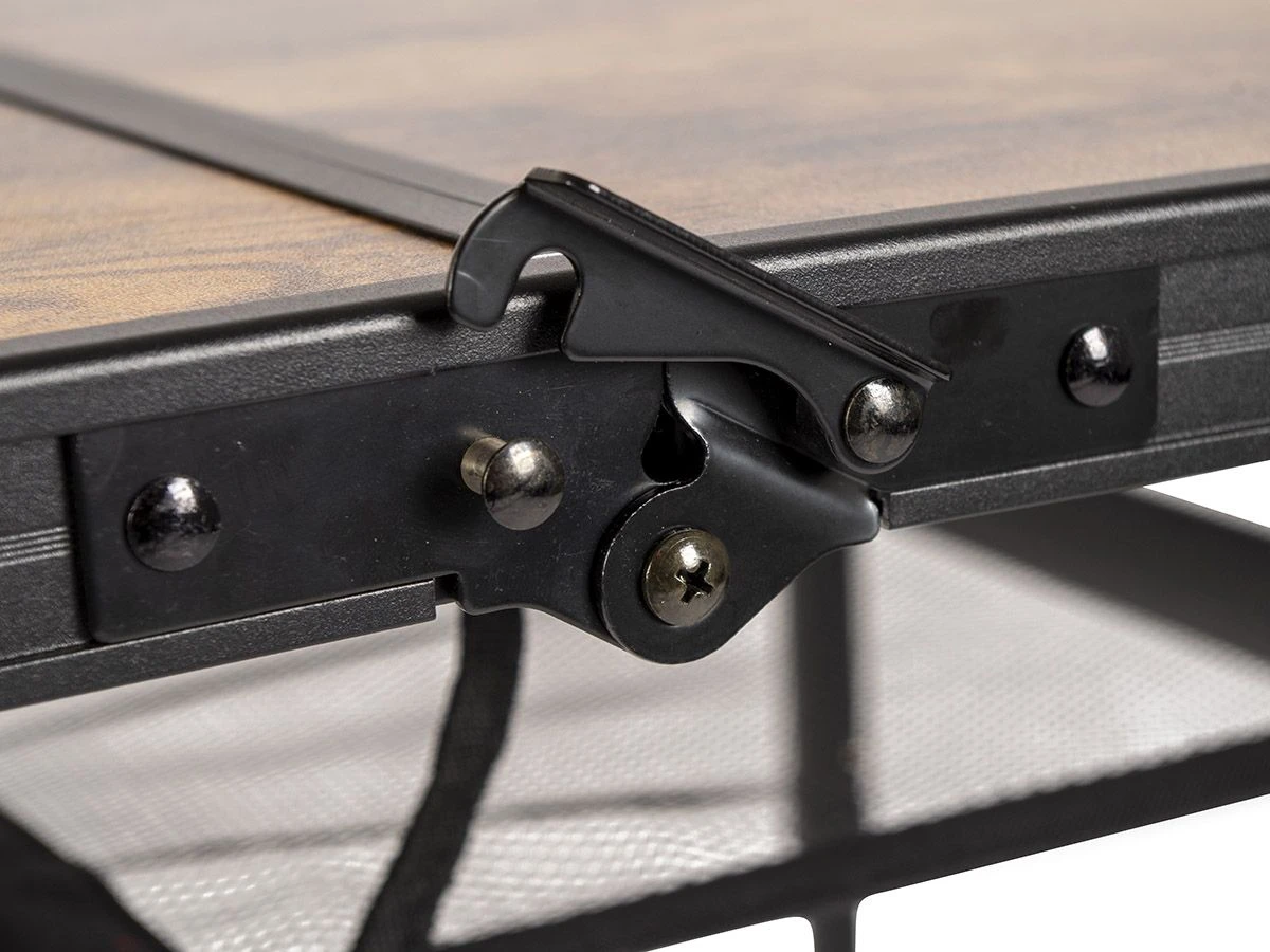Wil jij in industriële stijl kamperen? Kies dan voor deze stijlvolle tafel met een prachtig houtlook tafelblad. De tafel heeft een zwart frame wat in combinatie met het blad een stoere uitstraling heeft. De tafel is ideaal te gebruiken als eettafel voor 1 of maximaal 2 personen, of als handig bijzettafeltje. Onder het tafelblad bevindt zich een lectuurnet, ideaal voor het opbergen van bijvoorbeeld telefoons, tijdschriften, boeken en zonnebrandcrème.
