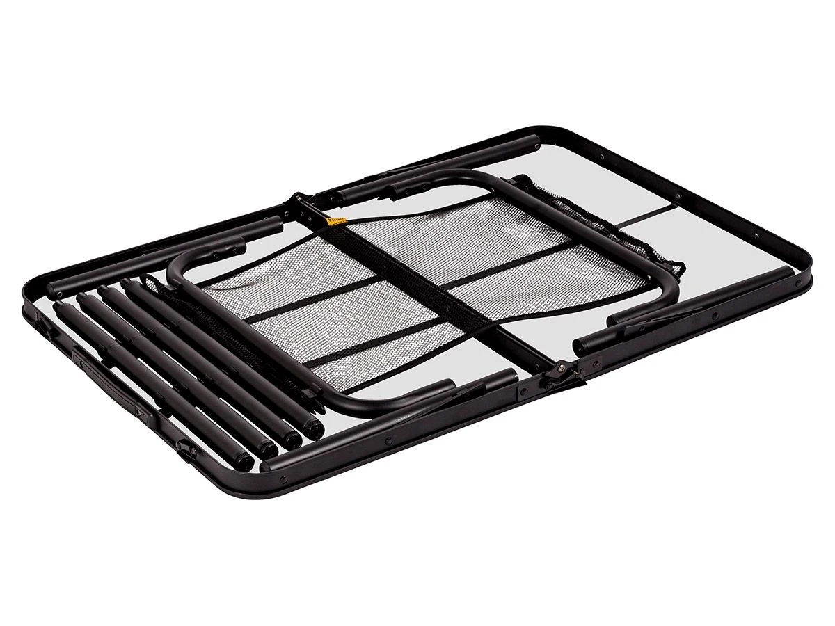De afneembare tafelpoten zijn op te bergen onder het tafelblad, vervolgens is de tafel tot een compact pakket dubbel te klappen. Dankzij het handvat kun je de tafel makkelijk meenemen.