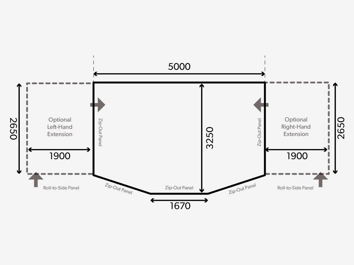 De voortent is 500 cm breed. Dit betekent dat je bij een caravan een rechte rail van minstens 500 cm nodig hebt om de voortent op te kunnen zetten. Wil je de voortent in de rail van je luifel schuiven? Dan moet de luifel minstens 500 cm lang zijn.