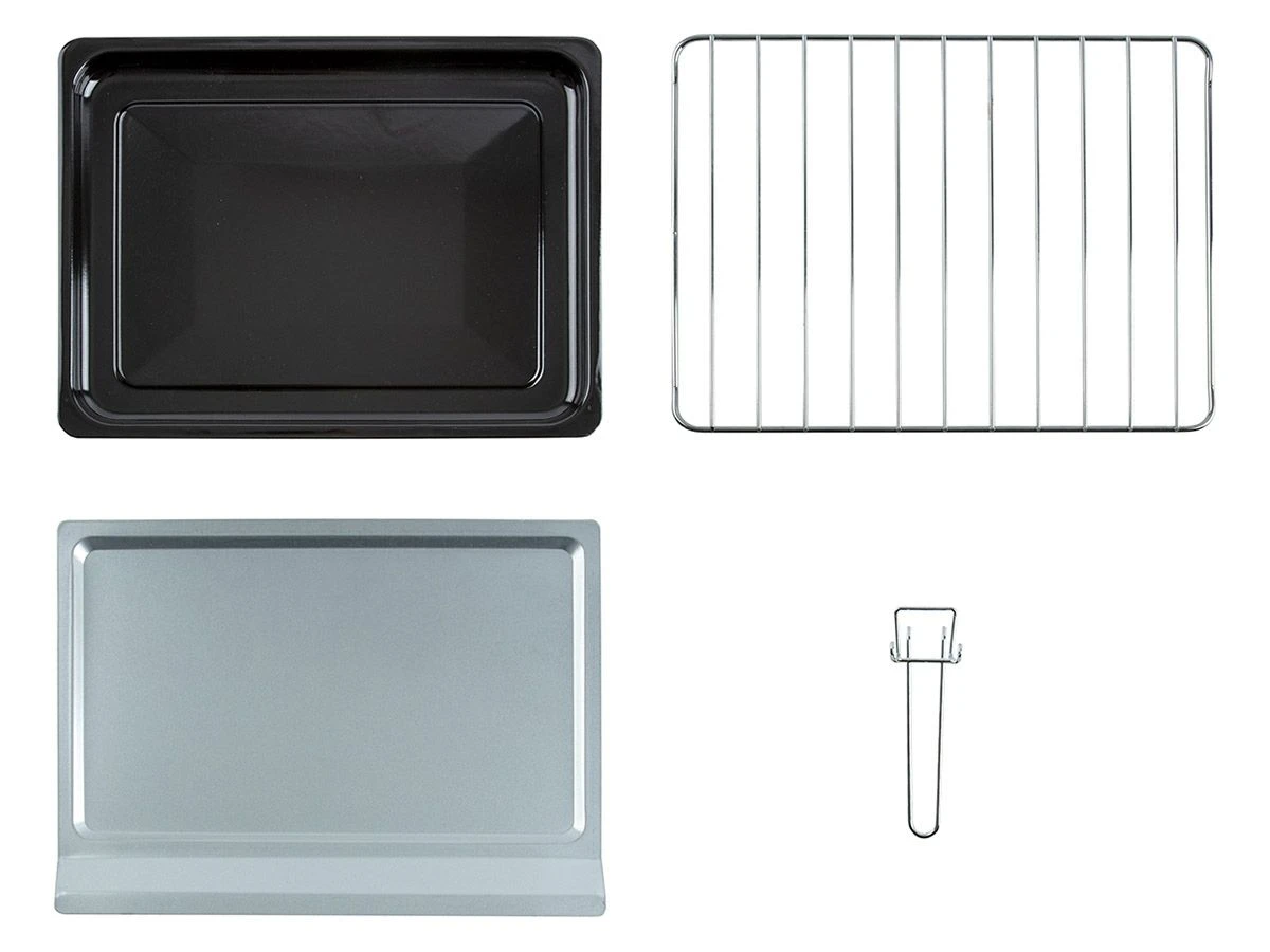 De oven heeft een inhoud van 20 liter, heeft een regelbare temperatuur tot 230°C en is voorzien van een timer die in kunt instellen tot 60 minuten. Door de non-sticklaag aan de binnenzijde, is de oven makkelijk schoon te maken. De oven wordt geleverd met een bakplaat, ovenrooster en een kruimelplaat.