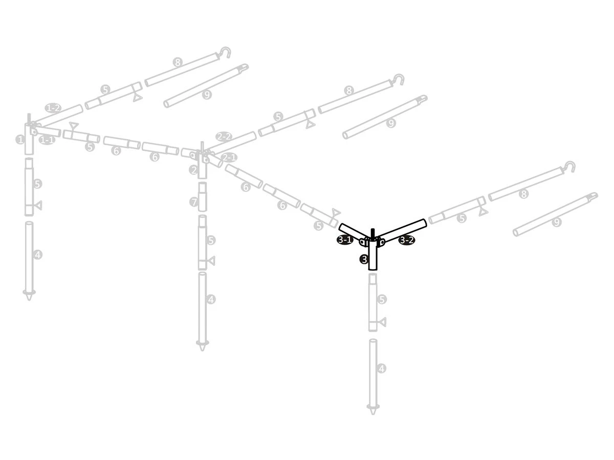 Dit stalen hoekstuk met een diameter van 25mm is het linker hoekstuk van een standaard Hypercamp luifelframe. Het nummer op het frameschema is 3.