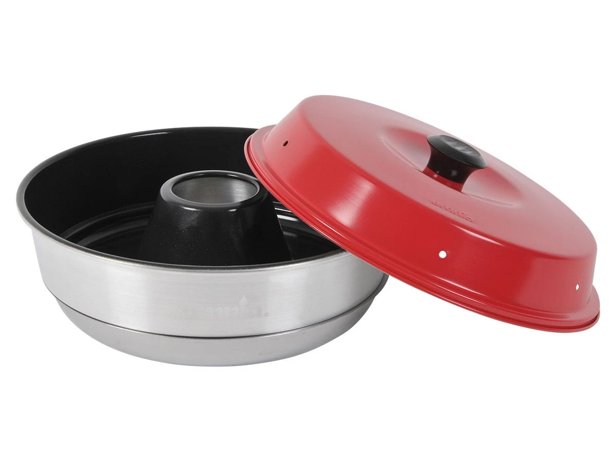 De Omnia antiaanbak bakvorm moet gecombineerd worden met het roestvrijstalen onderstel en de rood afgelakte deksel van de Omnia campingoven.