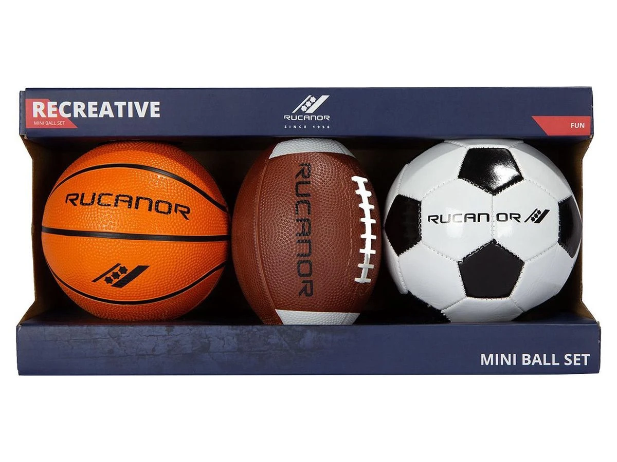 De set van Rucanor combineert de drie meest populaire balsporten ter wereld. De set bestaat uit een basketbal en voetbal van ca. 13 cm diameter en een rugbybal van ca. 17 cm diameter. De balletjes zijn licht en zacht en hierdoor geschikt voor alle leeftijdsgroepen! De balletjes worden opgepompt geleverd, wil je de hardheid veranderen? Dan kun je de balletjes zelf opblazen met een ballenpomp (niet meegeleverd).