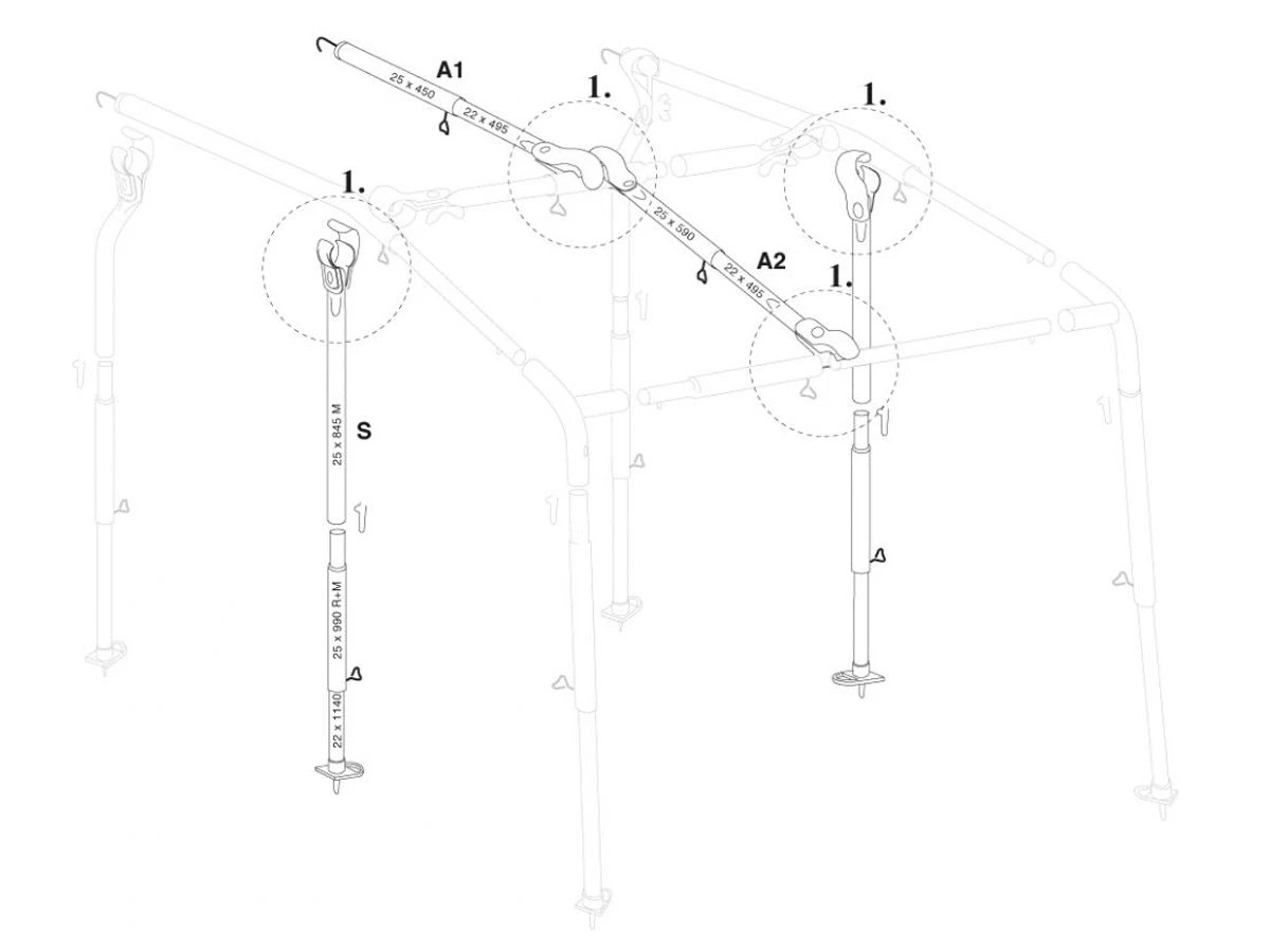 Verwacht je sneeuw of slecht weer? Dan kun je het frame extra verstevigen met deze verstevigingsset. De set bestaat uit twee staanders en twee dakliggers.